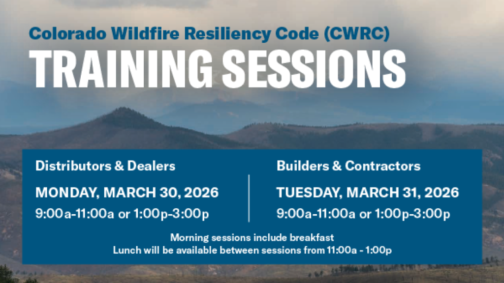 Attend the upcoming CO Wildfire Resiliency Code (CWRC) training sessions sponsored by LP SmartSide. All sessions will be in-person at the Courtyard Denver Cherry Creek, 1475 S. Colorado Blvd, Denver. There is also an option to join virtually. Session Topics Include: What the Colorado Wildfire Resiliency Code (CWRC) is - and what’s changing Wildland Urban [...]